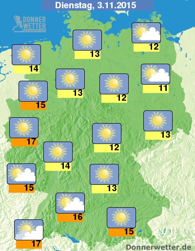 Am Dienstag scheint nach Auflösung örtlicher Nebel- und Hochnebelfelder verbreitet die Sonne. Im Nordosten ziehen noch einige, weitgehend lockere Wolken durch. Im Tagesverlauf ziehen aus Südwesten zunächst lockere, später im Südwesten auch teils dichte Wolken auf, es bleibt jedoch landesweit trocken. Die Temperatur steigt auf 11 Grad im nördlichen Brandenburg und bis 17 Grad im Rheinland.