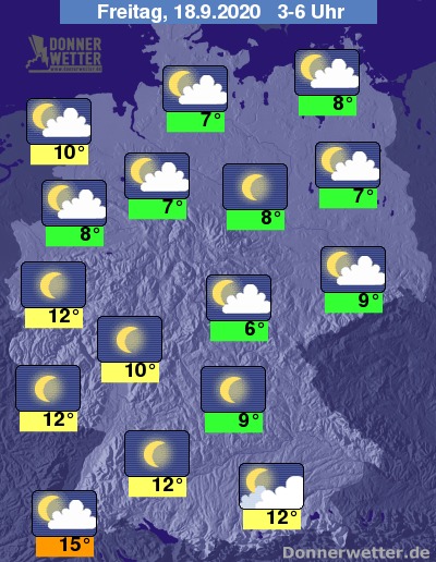 Tiefstwerte in der Nacht meist um 12 bis 6 Grad, am Oberrhein milder.