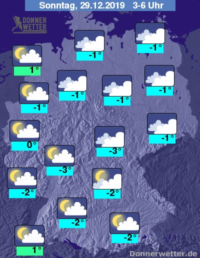 Am Sonntag bleibt es im Norden meist stark bewölkt oder trüb, im übrigen Land ist es hingegen überwiegend heiter bis sonnig oder aufgelockert bewölkt. Es bleibt überall trocken bei Werten von 1 Grad im Thüringer Becken und bis zu 8 Grad im Oberrheingraben.