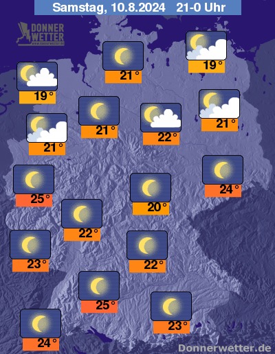 Die Temperaturen gehen in den frühen Morgenstunden zurück auf Werte um 22 Grad im Breisgau und 13 Grad auf Usedom.
