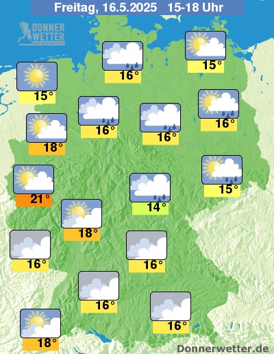 Am Freitagnachmittag zeigt sich der Himmel über der Osthälfte sowie der Landesmitte wechselnd oder stark bewölkt, dabei muss mit einzelnen Schauern gerechnet werden, auch lokale Gewitter können nicht ausgeschlossen werden. In den übrigen Landesteilen ist es meist gering bewölkt, in der Westhälfte scheint die Sonne auch von einem wolkenlosen Himmel.