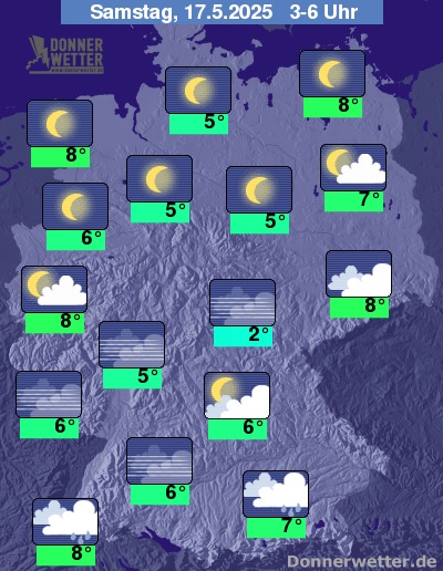 In der Nacht zum Samstag ist der Himmel südlich des Mains stark bewölkt, dabei muss hier gebietsweise mit Schauern oder Regen gerechnet werden. Nördlich davon ist es teils sternenklar, teils gering bewölkt und es bleibt trocken.