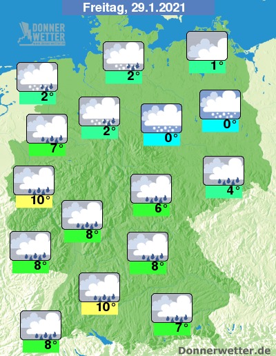 Die Tageshöchsttemperaturen liegen im Norden und Nordostn bei relativ kalten 0 bis 4 Grad, sonst werden milde 5 bis 11 Grad erreicht.