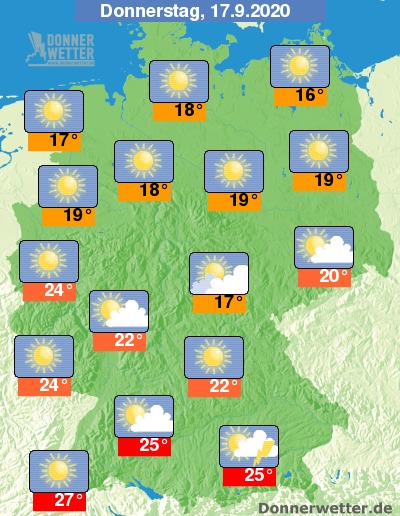 Die Tageshöchsttemperaturen liegen im Norden bei kühlen 16 bis 20 Grad. In den anderen Gebieten zwischen 20 und 24 Grad, südlich der Donau, sowie am Oberrhein werden weiterhin spätsommerliche 25 bis 28 Grad erreicht.