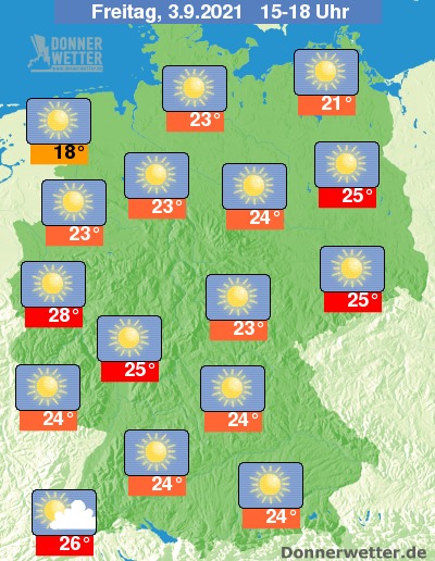 Die Temperaturen erreichen in der Spitze Werte um 18 Grad in Ostfriesland, 25 Grad an der Spree und um 28 Grad im Rheinland.