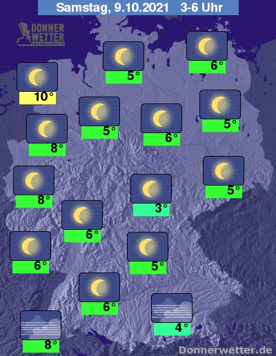 In der kommenden Nacht zeigt sich der Himmel über Deutschland verbreitet sternenklar. Im Alpenvorland ist es gebietsweise auch neblig-trüb oder stärker bewölkt, dazu bleibt es trocken. Die Temperatur sinkt auf 10 Grad in Wilhelmshaven und bis 3 Grad in Jena.