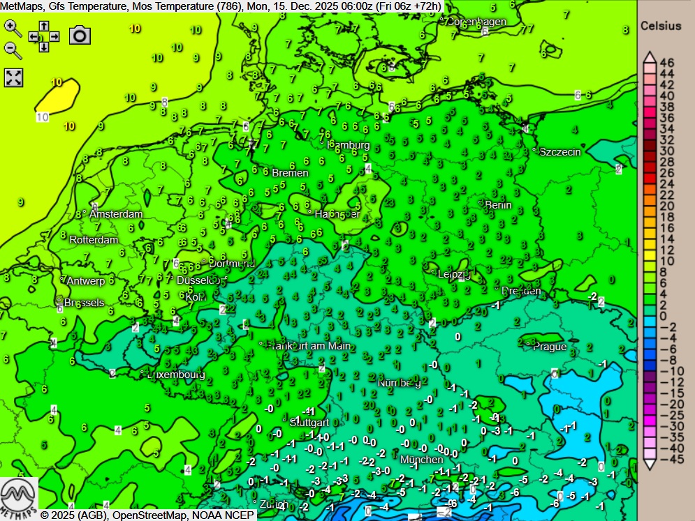Die Strömungs- / Wetter- sowie die Temperaturkarte für Montagfrüh (06:00 Uhr) nach GFS: