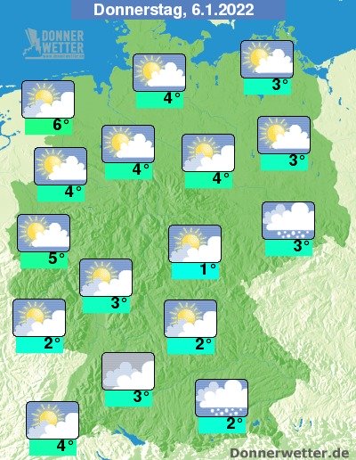 Am Donnerstag bleibt es über dem Süden und über Sachsen meist stark bewölkt und es kann etwas Schnee oder Schneeregen fallen. Im übrigen Land ist es oft locker bis aufgelockert und nur teilweise auch stark bewölkt, dazu bleibt es weitgehend trocken, Die Temperatur steigt auf 1 Grad in Erfurt und bis 6 Grad in Wilhelmshaven.