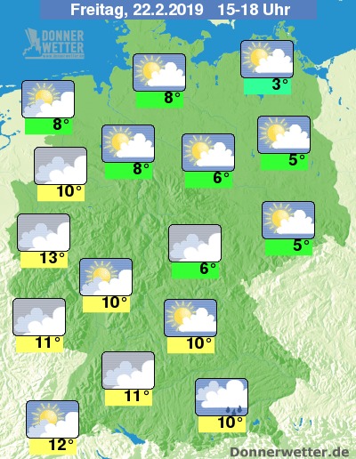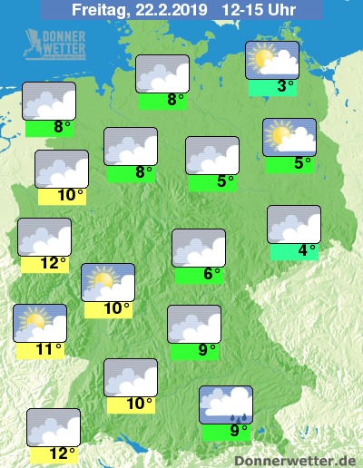Am Nachmittag ziehen sich die Regenwolken ins südliche Bayern und an die Alpen zurück, auf den Bergen fällt Schnee. Sonst dominieren abgesehen einiger größerer Auflockerungen oft die Wolken. In der trockenen und klareren Luft des Nordostens scheint auch mal für längere Zeit die Sonne.