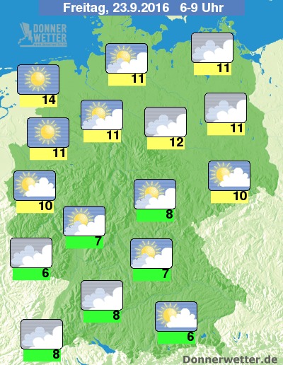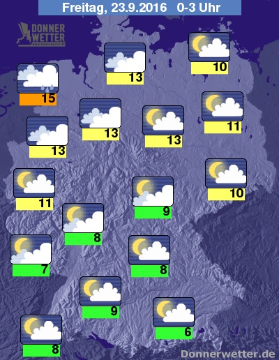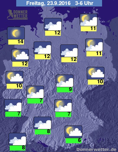 Die Tiefstwerte liegen in der Nordhälfte meist noch im zweistelligen Bereich, im Süden sinkt das Thermometer auf Werte um 9 bis 6 Grad C.