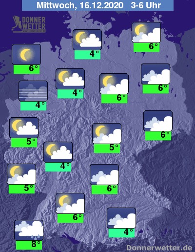 Während der zweiten Nachthälfte klart der Himmel von Nordwesten her landeinwärts auf und teilweise kommen die Sterne zum Vorschein. Lediglich im Süden sowie in Teilen Sachsens bringen dichte Wolken gelegentlich Regen oder Sprühregen.
