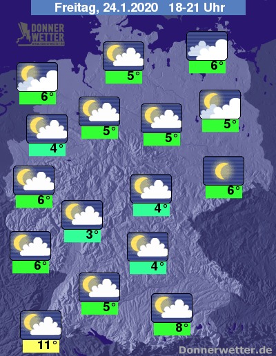 Am Abend präsentiert sich außerhalb von Nebel- oder Hochnebelgebieten wechselnd bewölkt bis klar. Abgesehen von örtlichen Nebelnässen bleibt es niederschlagsfrei.