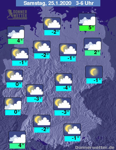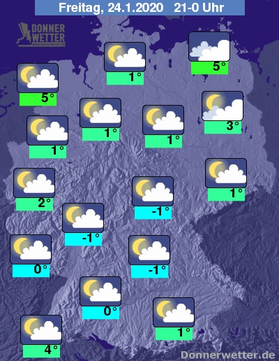 Bis zu den Frühstunden kühlt die Luft ab auf -5 bis plus 5 Grad. Am mildesten bleibt es an den Küsten bei mäßigem Wind und am Hochrhein, am kältesten wird es in den Mittelgebirgstälern. Es muss verbreitet mit Reifglätte gerechnet werden.