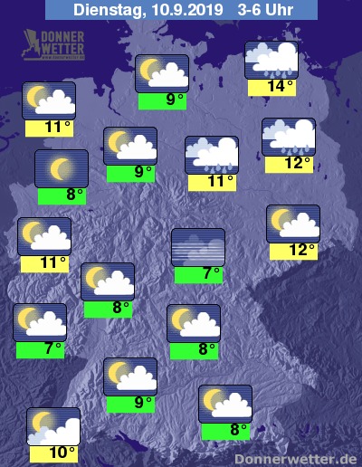 In der Nacht setzt sich zum Teil ergiebiger Regen im Nordosten des Landes weiter fort, unter dichten Wolken sinken die Tiefstwerte hier kaum ab und erreichen Werte um 14 bis 11 Grad. In den übrigen Landesteilen lockern die Wolken im Nachtverlauf immer weiter auf, am Niederrhein ist es teils auch sternenklar. Es bleibt meist trocken.