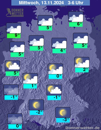 Die Temperaturen gehen in den Frühstunden zurück auf Werte um 9 Grad im äußersten Nordwesten und -3 Grad am Alpenrand.