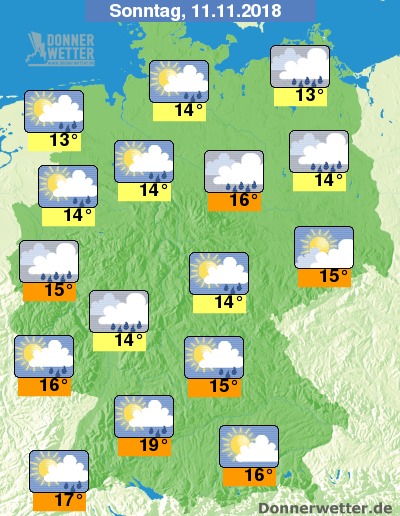 Am Sonntag ist es über dem Süden häufig heiter und es ziehen nur regional dichte Wolken mit Regen durch. Besonders über der Nordwesthälfte halten sich hingegen dichte Wolken und es bilden sich zeitweise Schauer. Im Osten ist es überwiegend wechselnd, teils stark bewölkt und Regen ist hier zumindest möglich. Die Temperatur steigt auf 13 Grad an der See und bis 19 Grad in Stuttgart.