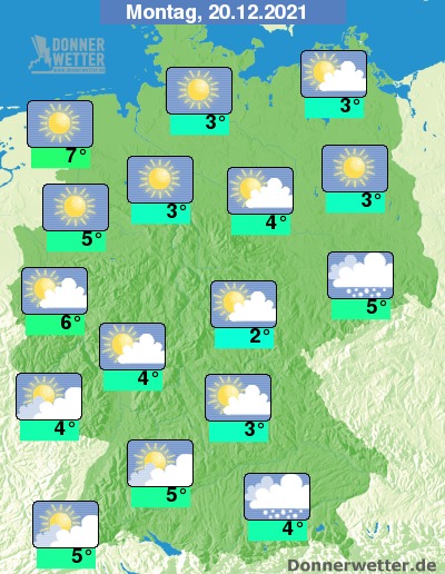 Am Montag zeigt sich das Wetter vor allem im Osten, Südosten, teils auch im Nordosten noch oft stark bewölkt, dazu sind einige Flocken möglich. Im übrigen Land ist es teils sonnig, teils bleibt es auch trüb, dabei bleibt es aber auch trocken. Die Temperatur steigt auf 2 Grad in Erfurt und bis 7 Grad in Wilhelmshaven.