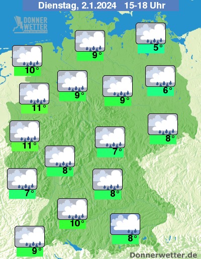 Am Nachmittag und Abend bleibt der Himmel über weiten Landesteilen stark bewölkt oder es ist bedeckt, dabei muss verbreitet mit kräftigem und anhaltendem Regen gerechnet werden. In den Staulagen der Mittelgebirge fällt teils auch unwetterartiger Dauerregen.