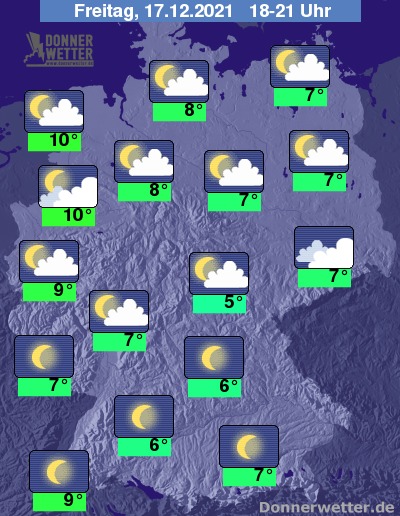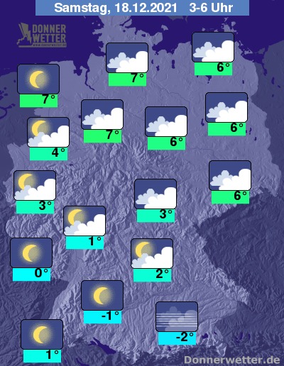 In der Nacht zum Samstag bleibt es über der Nordosthälfte des Landes bedeckt oder neblig-trüb. Weiter nach Südwesten hin lockert und klart der Himmel verbreitet auf. Es bleibt überall trocken bei Tiefstwerten von 7 Grad in Hamburg und -2 Grad in München.