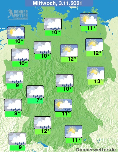 In der Nacht zum Mittwoch zieht von Südwesten Regen herein, der sich bis zum Morgen auch bis ins südliche NRW und nach Rheinland-Pfalz ausbreitet. Im übrigen Bundesgebiet ist es teils aufgelockert, teils stark bewölkt, dazu bleibt es trocken. Die Temperatur sinkt auf 8 Grad in Freiburg und bis 3 Grad in München.