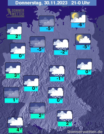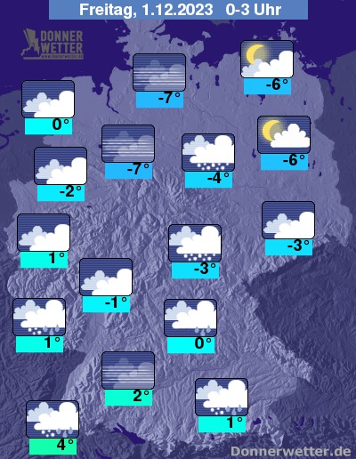 In der Nacht auf Freitag bleibt der Himmel meist stark bewölkt oder es ist bedeckt, im Süden und der Mitte muss dabei mit weiteren Schneefällen gerechnet werden. Am Oberrhein und im Alpenvorland fallen die Niederschläge auch als Schneeregen oder Regen, weiterhin besteht ein erhöhtes Glätterisiko. In der Nordhälfte bleibt es bei teils aufgelockerter Bewölkung bis auf einzelne mögliche Schauer in Küstennähe meist trocken.
