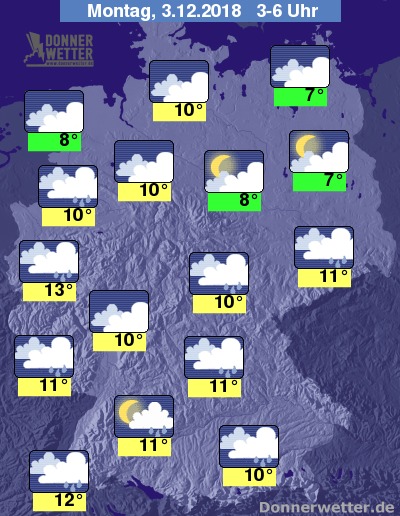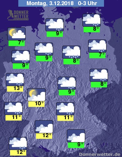 In der Nacht auf Montag bleibt der Himmel meist bedeckt, einzelne Wolkenlücken können sich zunächst in Ostfriesland, später dann auch östlich der Elbe sowie im Südwesten zeigen. Verbreitet muss in der Nacht mit Schauern gerechnet werden.