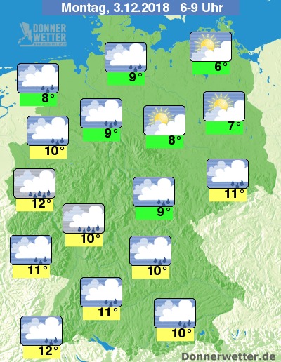 Der Montag startet in weiten Landesteilen mit einer geschlossenen Wolkendecke, im äußersten Nordosten kann es auch mal aufgelockert bewölkt sein. Vielerorts muss mit Schauern, in der Westhälfte teils auch kräftigem Regen gerechnet werden.