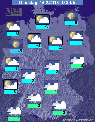 In der zweiten Nachhälfte lassen die Niederschläge immer mehr nach, in weiten Teilen der Nordhälfte lockert der Himmel auf und es bleibt trocken. Vereinzelte Schneeregen- oder Schneefälle sind vor allem zwischen Oberrhein und Berchtesgadener Land zu erwarten. Die Temperaturen sinken auf Werte um 3 Grad C am Alpenrand und -5 Grad im Nordwesten.