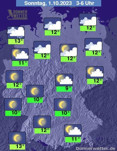 In der Nacht zum Sonntag ziehen über den Norden oft dichte Wolken hinweg, dabei kann es stellenweise auch regnen. Im Osten ist es auch teils stark, teils locker bewölkt, aber trocken. Im übrigen Land ist es verbreitet nur gering bewölkt oder sternenklar, dazu bleibt es trocken. Die Temperatur sinkt auf 13 Grad an der Nordsee und 9 Grad im Vogtland.