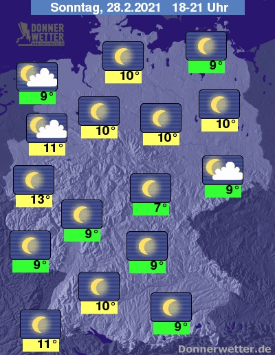 Heute Abend präsentiert sich der Himmel überwiegend sternenklar. Im Norden und Osten ziehen lokal auch lockere Wolken durch, dazu bleibt es trocken. Die Temperatur liegt anfangs noch bei etwa 7 Grad in Erfurt und bis 13 Grad in Köln.