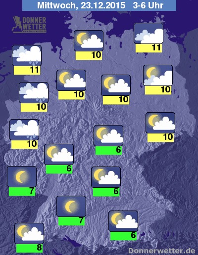 In der folgenden Nacht bleibt es über der Südosthälfte bei einer meist lockeren Bewölkung, gegen Morgen klart der Himmel vor allem im Süden, aber gebietsweise auch im Osten auf, dabei bleibt es trocken. Im Norden und Westen ist es zunächst oft stark, hier und da auch aufgelockert bewölkt, jedoch kommen hier in der zweiten Nachthälfte dichte Wolken und nachfolgend zeitweise Regen auf. Die Temperatur sinkt auf 11 Grad im Emsland und bis 6 Grad im Süden Bayerns. Im Norden und Westen weht starker und zum Teil stürmischer Wind, auf den Bergen und an der See herrscht teils Sturm, dabei sind schwere Sturmböen möglich.