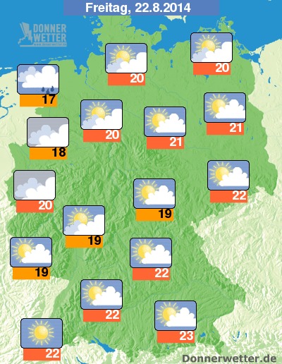 Am morgigen Freitag ist es besonders im Osten und Süden noch häufig heiter, sonst ist es teils aufgelockert, vor allem nach Nordwesten auch schon teils stark bewölkt und gegen Nachmittag sind im äußeren Norden und Westen und am Alpenrand Schauer und Gewitter möglich, sonst bleibt es aber weitgehend trocken. Die Temperatur steigt auf frische 17 Grad entlang der Ems und warme 23 Grad in Oberbayern.