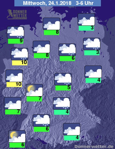 In der folgenden Nacht bleibt die Wolkendecke über Deutschland weitestgehend geschlossen, dabei breiten sich die meist leichten Regenfälle vom Westen des Landes im Laufe der Nacht bis auf die östlichsten Landesteile hin aus. Die Tiefstwerte liegen bei milden 10 Grad in Köln und etwa 3 Grad in Neubrandenburg.