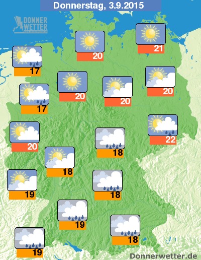 Am Donnerstag bleibt es vor allem vom Süden bis in die Mitte Deutschlands meist stark bewölkt und es fällt zeitweise Regen. Auch über Sachsen kann es bei teils starker Bewölkung zeitweise regnen. Im Norden und Westen ist es zumeist heiter bis sonnig, jedoch sind im Nordwesten auch einzelne Schauer möglich, sonst bleibt es jedoch weitgehend trocken. Die Temperatur steigt auf 17 Grad an der niederländischen Grenze und bis 22 Grad in Niederschlesien.