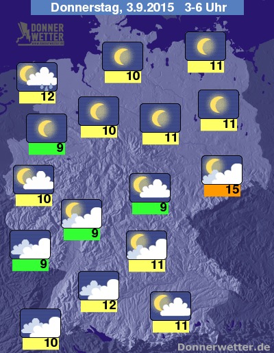 In der kommenden Nacht bleibt es vor allem im Norden, oft aber auch in der breiten Mitte Deutschlands sternenklar und dazu trocken. Weiter nach Süden hin zieht hingegen häufig starke Bewölkung durch, Regen ist dabei jedoch kaum zu erwarten. Die Temperatur sinkt auf 15 Grad in Riesa und etwa 9 Grad am Pfälzer Wald.
