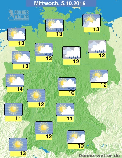 Am Mittwoch ist es vom Südwesten, über den Westen bis in den Nordwesten des Landes verbreitet heiter oder sonnig und trocken. Hingegen ziehen über die Osthälfte meist viele und vor allem im Osten dichte Wolken hinweg und es können sich einzelne Schauer bilden. Die Temperatur steigt auf 10 Grad im Eichsfeld und bis 14 Grad in der Kölner Bucht.