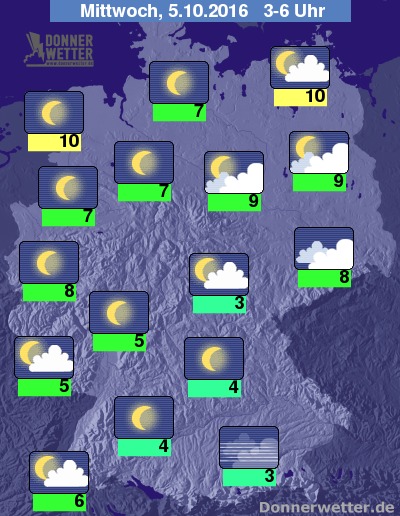 In der kommenden Nacht ziehen vor allem über den Nordosten oft viele und teilweise auch dichte Wolken, Regen fällt dazu jedoch nur selten. Im übrigen Bundesgebiet zeigt sich ein verbreitet sternenklarer Himmel, dazu bleibt es trocken. Am Alpenrand bildet sich stellenweise Nebel. Die Temperatur sinkt auf 11 Grad in Stralsund und bis 3 Grad im Vogtland.