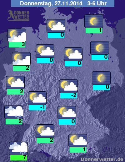 In der kommenden Nacht ziehen im Nordwesten, Westen und Südwesten der Republik häufig dichte Wolken durch, die für regional etwas Regen sorgen können. In den anderen Landesteilen bleibt es dagegen bei überwiegend lockerer bis aufgelockerter Bewölkung trocken, nach Osten und Nordosten hin zeigt sich der Himmel häufig sternenklar. Die Temperatur sinkt auf noch recht milde 7 Grad in Freiburg und auf etwa -2 Grad im Thüringer Becken.