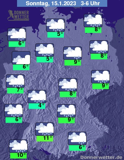 Am Sonntag zieht oft starke, teils auch aufgelockerte Bewölkung durch, dabei bilden sich gebietsweise Schauer, die zum Teil auch als Schnee oder Schneeregen niedergehen. Die Temperatur erreicht 6 Grad in Cuxhaven und bis 11 Grad in Stuttgart. Vor allem im Norden weht ein stürmischer Wind, an der See und auf den Bergen herrscht teilweise schwerer Sturm.
