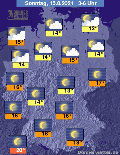 In der folgenden Nacht bleibt der Himmel über der Südhälfte Deutschlands sternenklar. Im Norden ziehen hingegen schon oft einige und teils dichte Wolken durch. Im Laufe der Nacht nimmt die Bewölkung hier noch weiter zu, dazu bleibt es aber trocken. Die Temperatur sinkt auf tropische 20 Grad in Freiburg und bis 13 Grad in Neubrandenburg.
