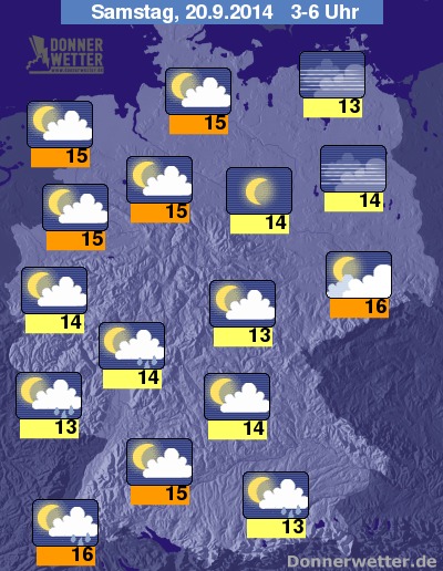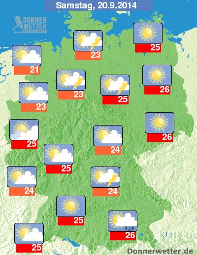 Der Samstag startet noch überwiegend freundlich und trocken, regional sind aber schon Schauer und Gewitter unterwegs, diese werden mit zunehmender Tageslänge, besonders vom Nachmittag bis Abend, häufiger. Regional kann es aber auch trocken bleiben. Weitgehend trocken und meist auch sonnig bleibt es indes noch im Nordosten des Landes. Die Temperatur steigt auf  21 Grad an der Nordsee und bis 26 Grad in Berlin.