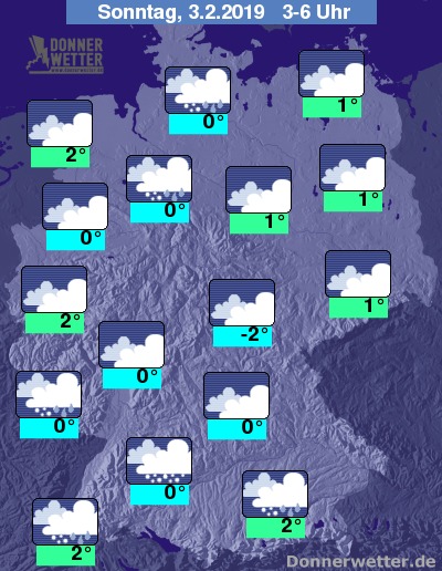 In der folgenden Nacht ist der Himmel bedeckt, im Süden fällt zeitweise, sonst fällt gebietsweise Schnee oder Schneeregen. Vielerorts bleibt es auch trocken bei Tiefstwerten von 2 Grad entlang des Rheins und bis -2 Grad im Thüringer Becken.