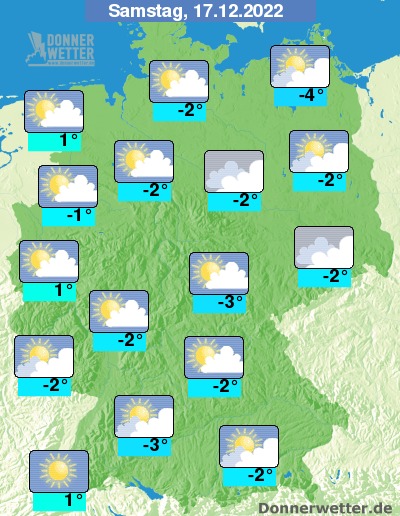 Am Samstag ist es häufig heiter bis sonnig, stellenweise hält sich allerdings Nebel oder Hochnebel, dabei bleibt es trocken. Die Temperatur erreicht -4 Grad in Stralsund und bis 1 Grad in Freiburg.