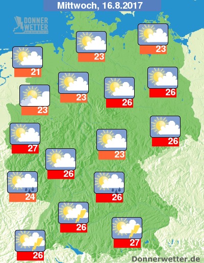 Am Mittwoch zeigt sich das Wetter verbreitet heiter, hier und da auch aufgelockert bewölkt und dabei trocken. Im Süden bleibt es den Tag über jedoch meist stark bewölkt, hier bilden sich gebietsweise Schauer sowie einzelne Gewitter. Die Temperatur steigt auf 21 Grad in Wilhelmshaven und bis 27 Grad in München.