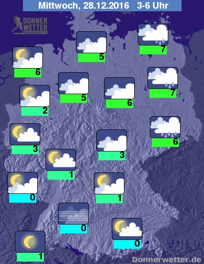 In der bevorstehenden Nacht zeigt sich die Nordosthälfte Deutschlands überwiegend bedeckt, Regen fällt dabei zeitweise vom Nordosten, über den Osten bis in den äußeren Südosten Deutschlands, sonst ist es mehrheitlich trocken. Deutlich freundlicher bei meist nur lockeren Wolken oder klarem Himmel ist es über dem Süden, Südwesten und Westen des Landes, hier bleibt es trocken. Die Temperatur sinkt auf 7 Grad in Berlin und bis etwa 0 Grad im Kraichgau.