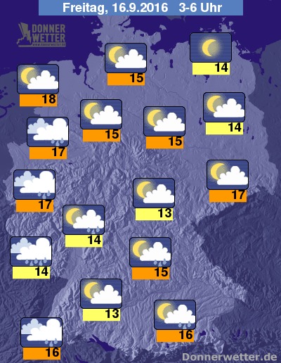 In der folgenden Nacht ist es im Norden und Osten anfangs noch sternenklar, im weiteren Verlauf ziehen hier zunehmend auch einige Wolken auf, die jedoch keinen Regen bringen. Über der Südwesthälfte ist es teils locker, gebietsweise aber auch stark bewölkt, dazu können sich hier und da Schauer, selten auch einzelne Gewitter bilden. Die Temperatur sinkt auf 18 Grad im nördlichen Emsland und bis 13 Grad am Odenwald.