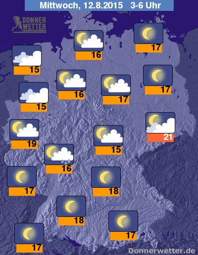 In der bevorstehenden Nacht zeigt sich der Himmel über dem Süden Deutschlands weitgehend sternenklar, dabei bleibt es trocken. Weiter nach Norden hin ist es zumeist locker bis aufgelockert bewölkt, besonders nach Nordwesten hin aber auch verbreitet dicht bewölkt, dabei bleibt es ebenso trocken. Im Nordosten zeigt sich ein oft sternenklarer Nachthimmel. Die Temperatur sinkt auf 21 Grad in Görlitz und bis 15 Grad im Eichsfeld.
