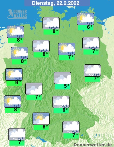 Heute ist es meist stark, teils auch aufgelockert bewölkt, im Süden bilden sich gebietsweise Regen- oder Graupelschauer, sonst bleibt es zunächst weitgehend trocken. Zum Abend hin kommt jedoch im Westen und Norden erneut Regen auf. Die Temperatur steigt auf 5 Grad im Vogtland und bis 9 Grad im Rheinland. An der Nordsee ist es weiterhin oft stürmisch.