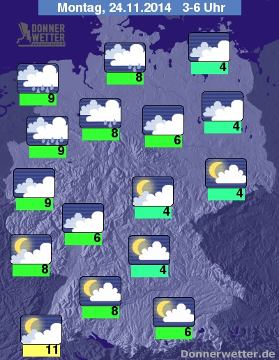 In der Nacht zum Montag breiten sich von Nordwesten her dichte Regenwolken weiter nach Südosten hin aus und erreichen zum Morgen hin etwa eine Linie von NRW bis nach Mecklenburg-Vorpommern. Weiter nach Südosten bleibt es bei weitgehend aufgelockerter, teils auch noch lockerer Bewölkung trocken. Stellenweise bildet sich wieder Nebel oder Hochnebel. Die Temperatur sinkt auf 11 Grad in Freiburg und bis 2 Grad in Ostbayern.