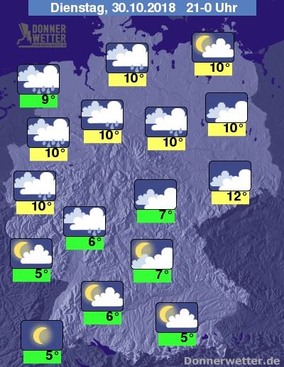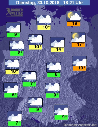 Am Abend gibt es im Nordosten Wolkenlücken, sonst präsentiert sich der Himmel meistens bedeckt und es fällt gebietsweise Regen. Mit 14 bis 19 Grad bleibt es im Nordosten sehr mild, sonst liegen die Temperaturen gemäß der Jahreszeit zwischen 6 und 13 Grad, wobei es im Saarland am kühlsten ist.